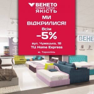 На 2-му поверсі гіпермаркету «Хоум Експрес» відкриття меблевого салону «Венето»! Підготуйтеся до новорічних свят та порадуйте себе та близьких новими корисними подарунками: ортопедичними матрацами, ліжками та диванами, а салон «Венето» подарує вам додаткову знижку -5% на покупки у період з 05.12.2018 до 18.12.2018!